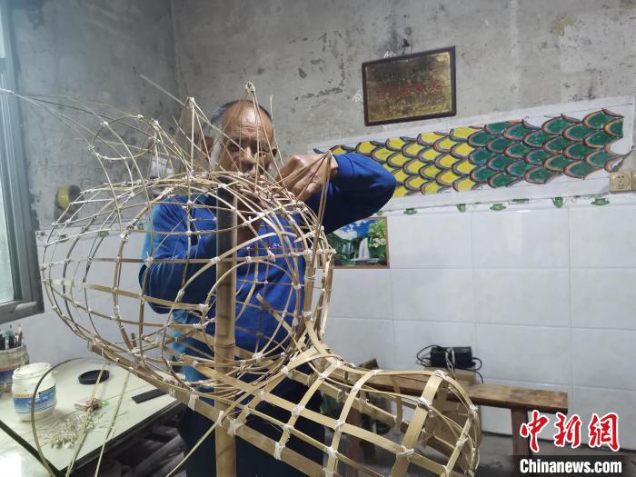 罗德书在编制雨坛彩龙骨架。中新网