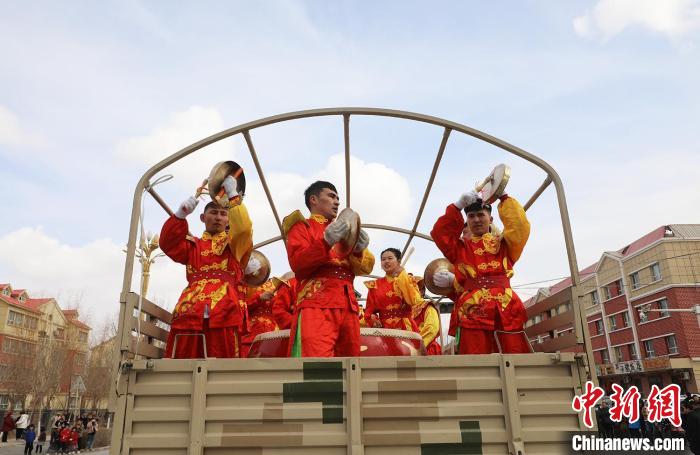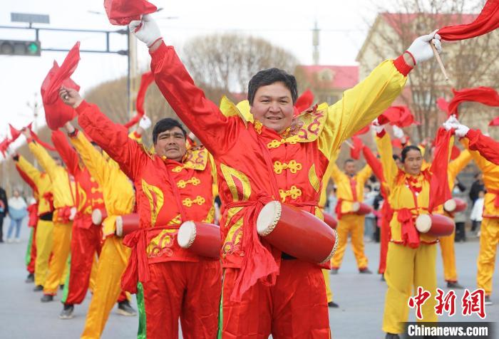 2月6日下午,社火表演队从新巴扎红绿灯路口出发,在震耳的锣鼓声中,来自各连队、社区的9支社火表演队、千余名各族民众闪亮登场,威风锣鼓、麒麟舞、骑毛驴、划旱船、腰鼓、红旗队、大头娃娃等各种表演应有尽有、姿态万千,让人应接不暇。图为腰鼓表演。