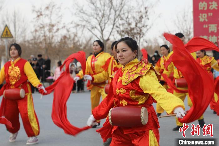 随着新春脚步的临近,年的氛围也愈发浓烈。2月6日,地处新疆南部的图木舒克市金胡杨镇开展社火展演活动。现场热闹喜庆,不仅给春节增添了一抹亮色,也给各族民众带来欢乐和喜悦。图为腰鼓表演。