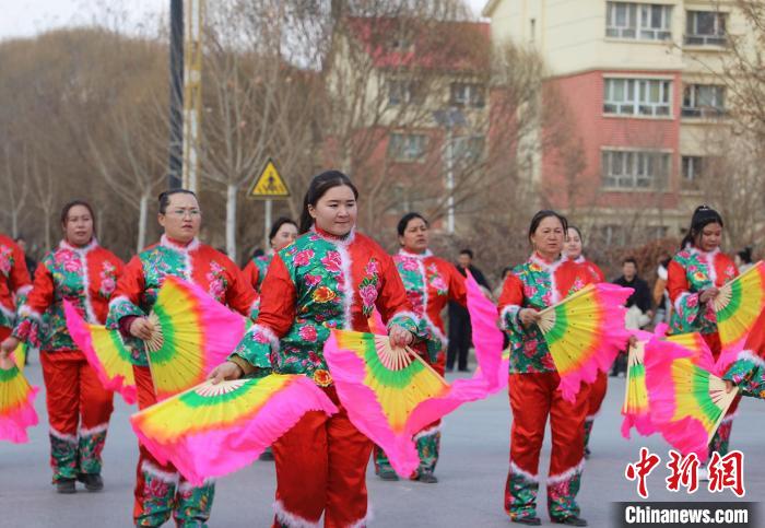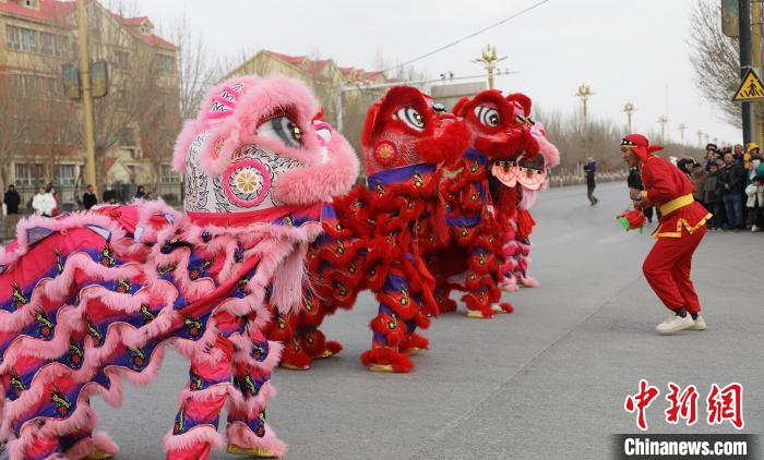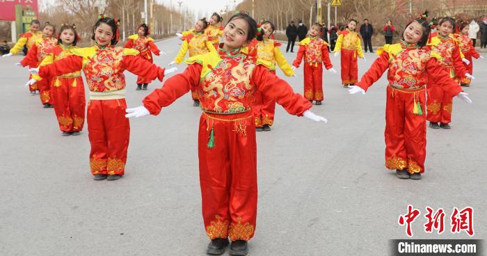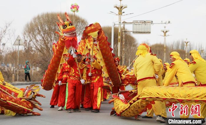 据了解,社火展演活动已在金胡杨镇举办三年,也是较大规模的优秀传统文化艺术展演,每年活动丰富多彩,且创意逐年增多,今年还利用抖音直播,让到不了现场的观众体验线上社火,观看量达万余人次。图为舞龙表演。
