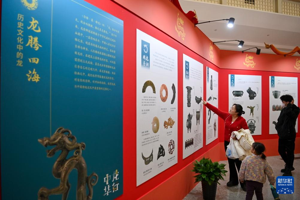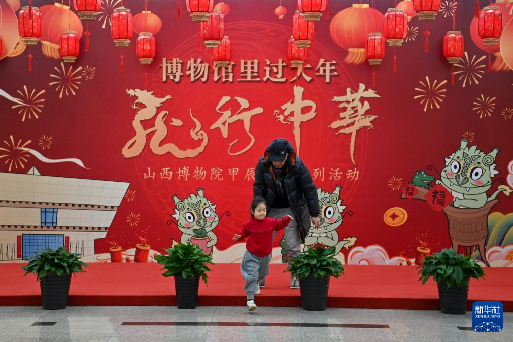 龙是对中华民族影响最为深远的文化符号。农历甲辰龙年即将到来之际,中国各地不少博物馆精心准备与龙相关的文化大展,吸引民众龙年看龙展。图为2月7日,小朋友和家长在山西博物院游玩。新华社