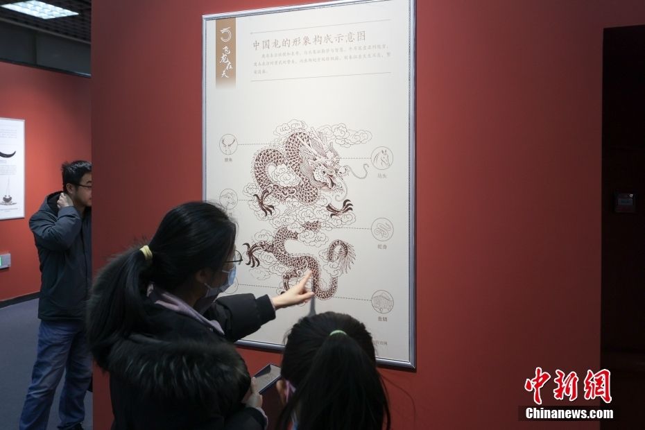 2月6日,“龙行中华——甲辰龙年生肖文化联展”在位于北京的中国国家自然博物馆开展。展览分为四大单元,通过精美的图文、视频以及珍贵文物,全面展示了龙的形象、历史、文化及其生物学知识。图为家长带小朋友参观《中国龙的形象构成示意图》。中新网