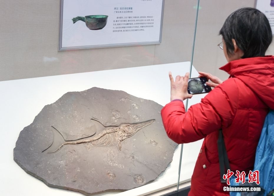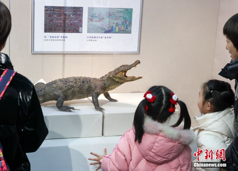 观众在“龙行中华——甲辰龙年生肖文化联展”参观扬子鳄的标本。中新网