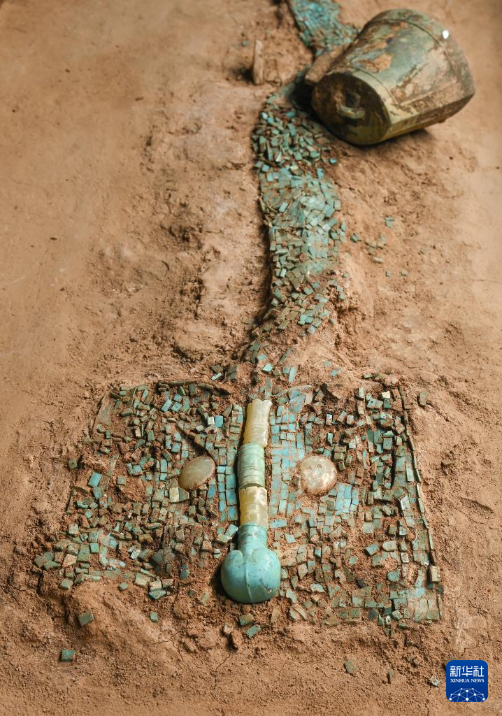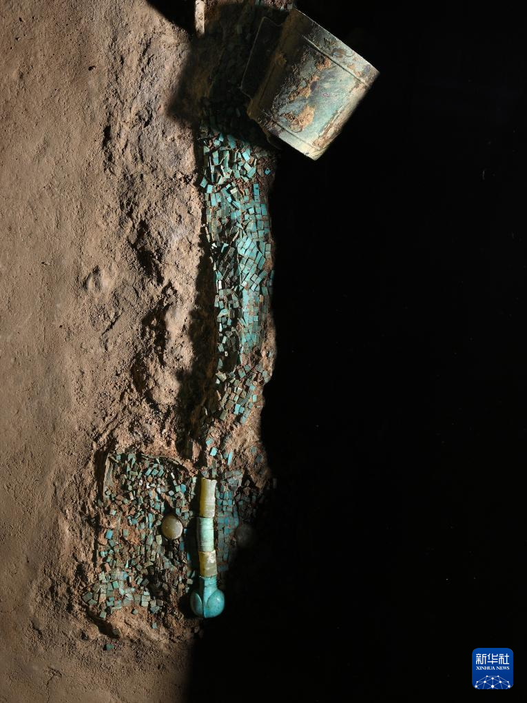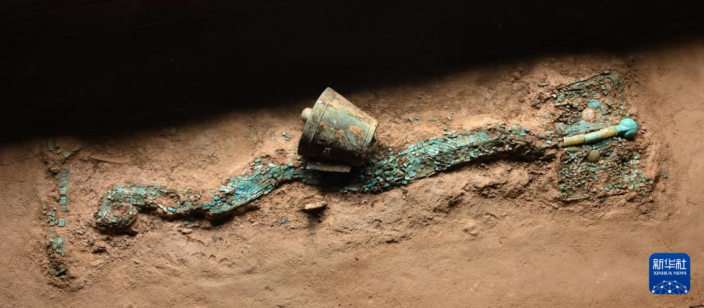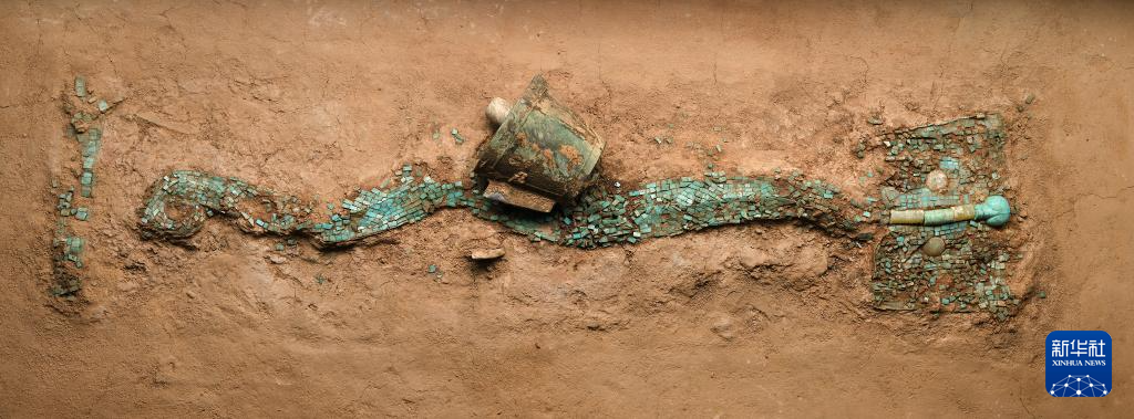 龙图腾崇拜作为中华民族的传统信仰,自新石器时代至今一脉相承。 “二里头遗址的龙文化继承了中原龙山时代的龙文化并有了新的发展,对之后的商文化有重要影响,夏代龙文化在中国龙文化发展史上有重要地位,是龙图腾崇拜最为重要的源头之一”, 杨硕说。 绿松石龙形器用工之巨、制作之精、体量之大,在中国早期龙形象文物中十分罕见,具有极高的历史、艺术与科学价值。 巨大的龙头以三节实心半圆形的青、白玉柱组成额面中脊和鼻梁,绿松石质蒜头状鼻端硕大醒目,眼眶中以顶面弧凸的圆饼形白玉为睛。龙身由多个菱形单元拼接构成长条形身体,龙脊中线处两侧的饰片进行了倒角处理,形成棱角分明的脊背线条。每一片饰片均经过精细打磨,大小2-9毫米不等,厚度仅1毫米左右,像鳞片一样连续分布于全身。 图为河南洛阳偃师二里头遗址3号宫殿南院发掘出土的3号墓中,绿松石龙形器初露端倪(资料照片)。