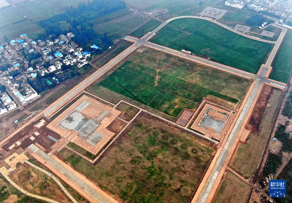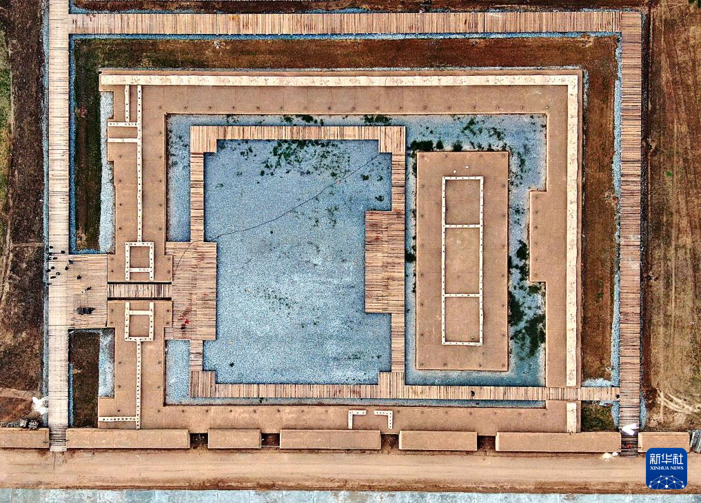 “龙旂(旗)阳阳,和铃央央”,《诗经》中关于祭祀场景的描写,与绿松石龙形器、铜铃共存的情况颇为契合,引发学者对这件器物用途的比较和猜想。二里头夏都遗址博物馆考古研究部副主任杨硕介绍,龙在中国古代既是整个民族膜拜的神灵,也是帝王的象征,有专家推测绿松石龙形器是作为权杖的龙牌,或为被后世称作“瑞圭”的礼器;也有观点认为这位墓主人有可能是夏王朝负责祭祀图腾神物的御龙氏,以绿松石龙形器为形象的龙旗和铜铃的固定搭配,应是祭祀场合中使用的仪仗器具。图为河南洛阳偃师二里头考古遗址公园(2019年10月16日摄,无人机照片)。