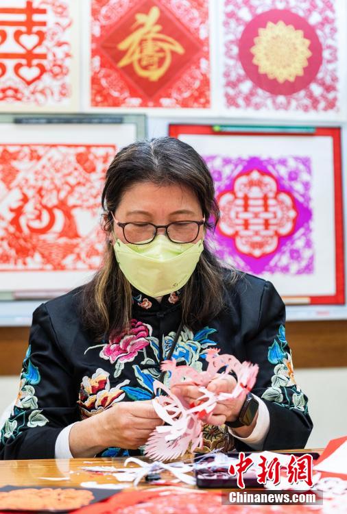 一把小巧的剪刀,几张富有年味的彩纸,言谈之间,纸片纷落,不一会儿一幅栩栩如生的剪纸作品就跃然孙虹的指尖。图为孙虹在仔细创作。