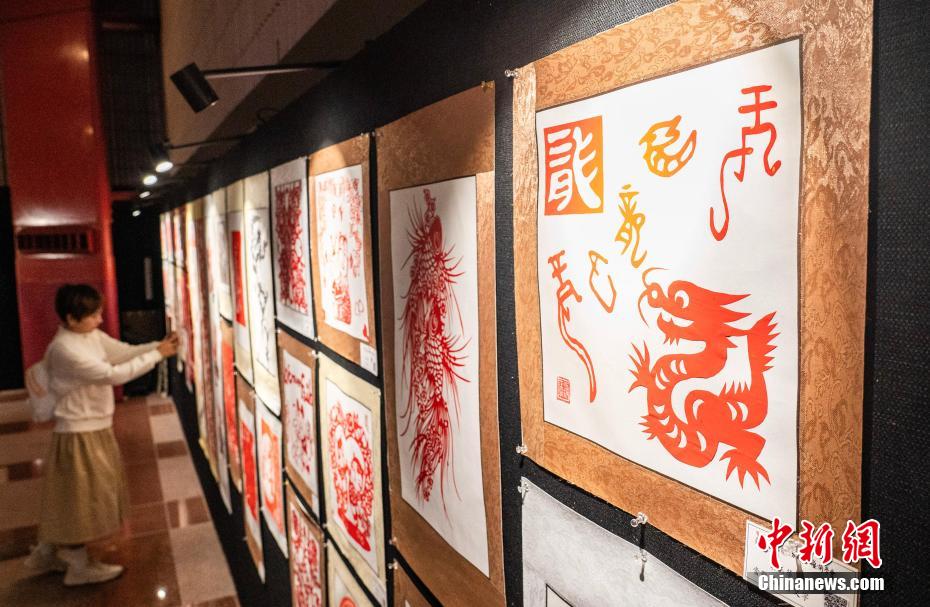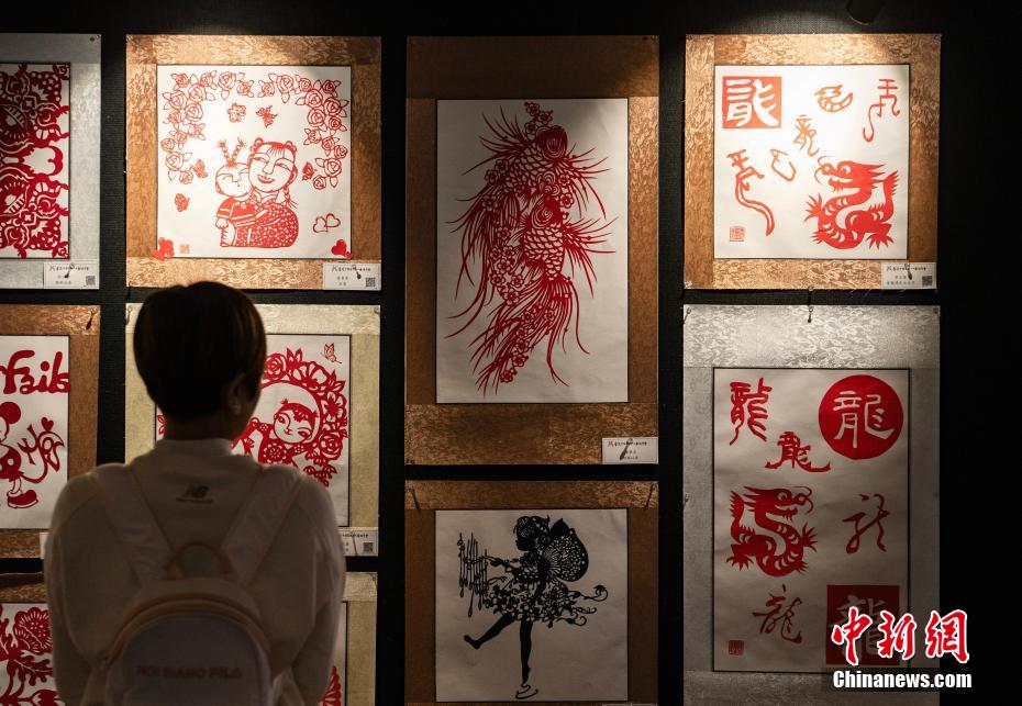 “香港中国剪纸文化艺术学会”2024年1月中旬在香港文化中心举行的剪纸作品展,观众参观龙年主题剪纸等作品。