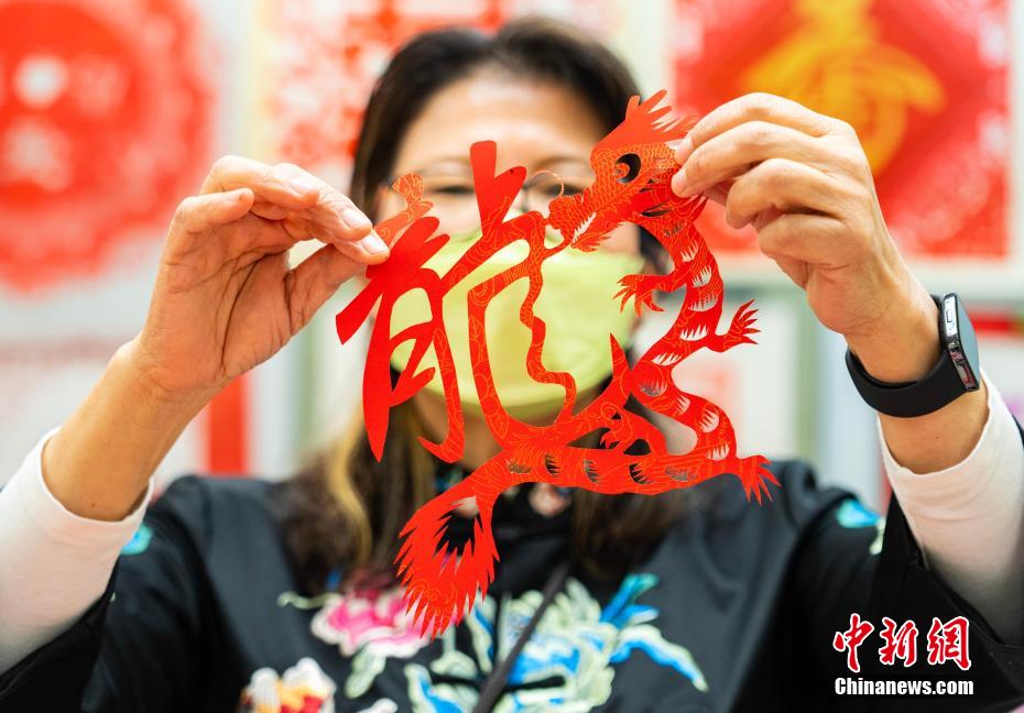 孙虹展示即兴创作的龙年主题剪纸作品。