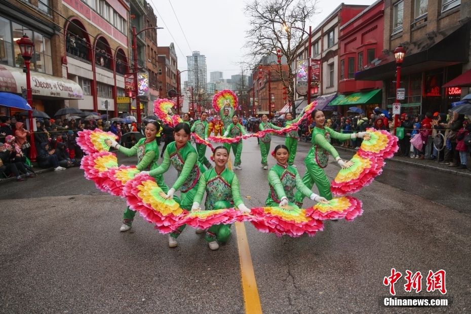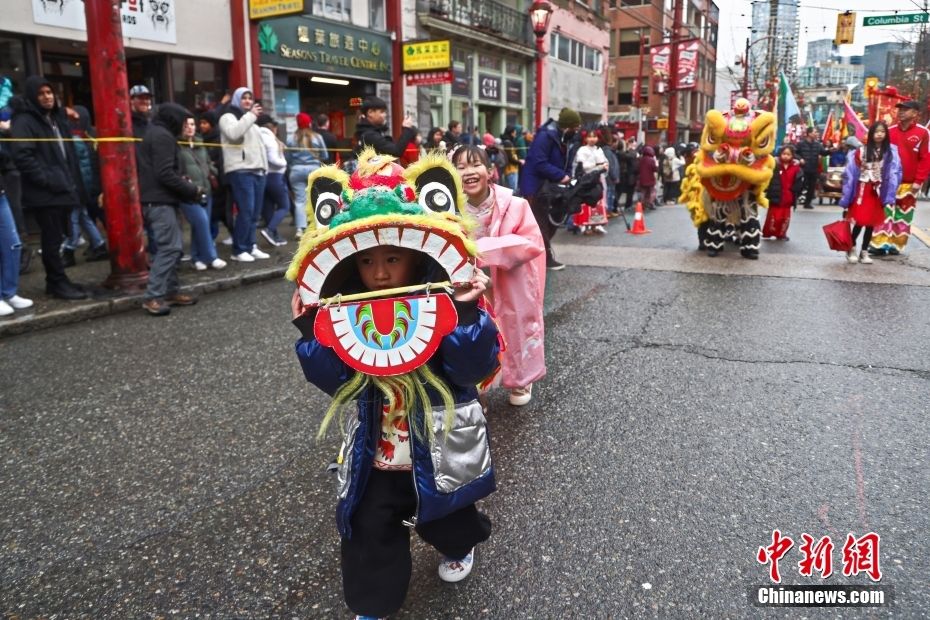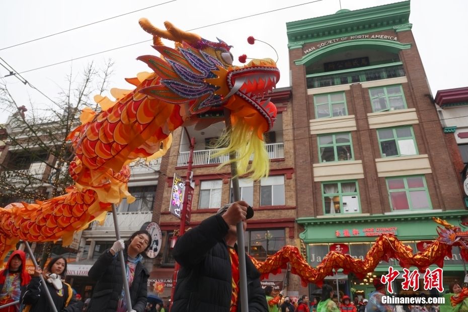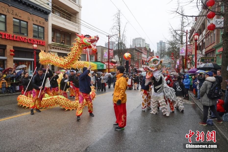 当地时间2月11日,农历甲辰龙年正月初二,作为加拿大华人社区规模最盛大的春节庆祝活动,温哥华华埠新春大游行冒雨举行。来自华人社区及其他多个族裔社区的约百个团体参加本次新春大游行,规模创下历史新高。图为舞龙舞狮在游行中同场表演。