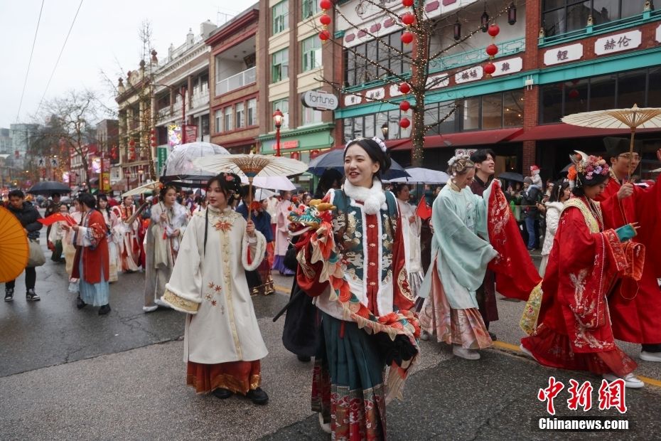 华人青年身着汉服参加游行。