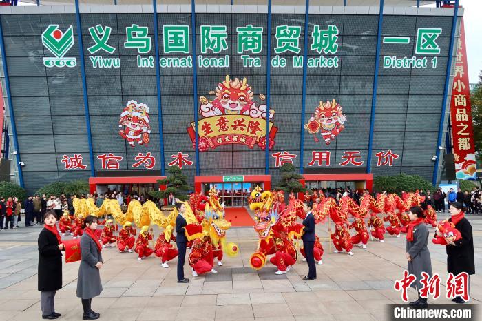 2月21日,全球最大的小商品集散地——义乌国际商贸城迎来龙年开市,到义乌拼速度、抢先机的外商明显增多。据统计,开市首日,商城接待客流达到22.8万人次, 7.5万户商家迎来了新春“开门红”。 图为义乌国际商贸城一区举行开市活动。中新网