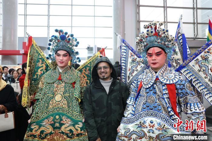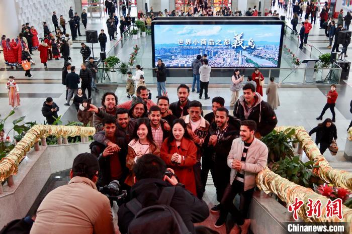 开市活动现场,海外采购商与演职人员合影。中新网
