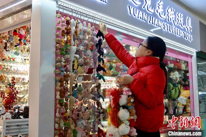 杭州海关所属义乌海关发布数据显示,2023年,该市进出口总值5660.5亿元,同比增长18.2%;其中出口5005.7亿元,同比增长16.0%;进口654.8亿元,同比增长38.7%。图为商户在店铺挂起“好运”。中新网