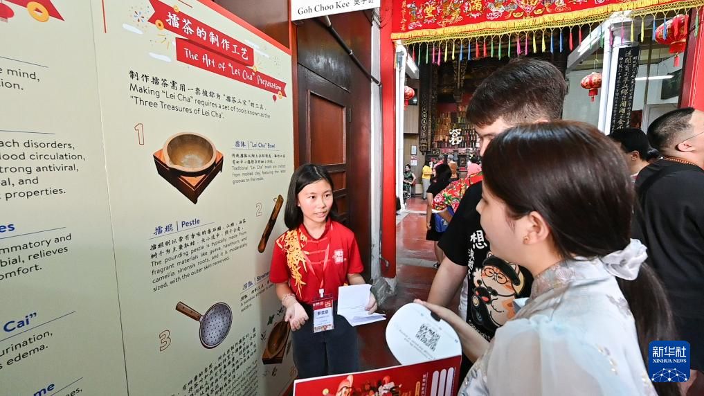 在马来西亚槟城州首府乔治市古迹区,一年一度的槟城庙会2月18日如期举行。槟城庙会是槟城的新春品牌活动之一,今年迎来了第25周年。2024甲辰年槟城庙会以“我们的故事”为主题,串连了古迹区12条街道和20多家百年宗祠、庙宇和会馆,设置了11个主题舞台和众多文化摊位,当地民众与游客体验、了解中华传统文化,感受热情洋溢的春节氛围。图为2月18日,在马来西亚槟城庙会,当地学生为游客讲解客家擂茶习俗。新华社
