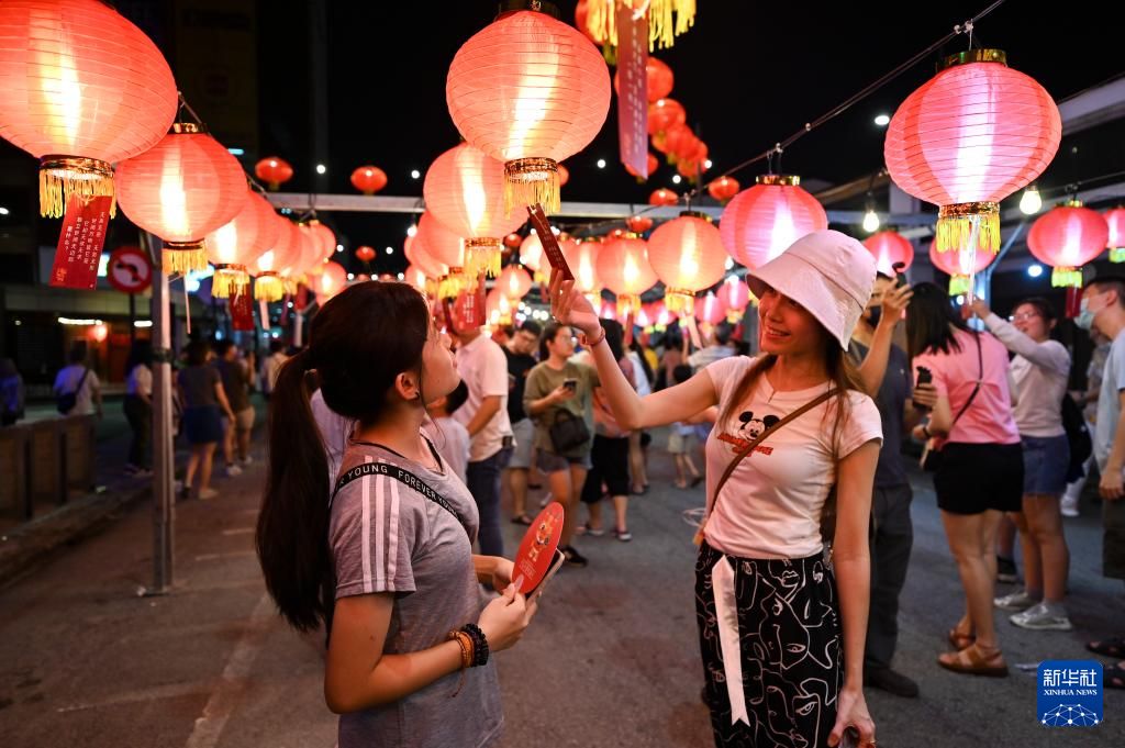 2月18日,在马来西亚槟城庙会,人们参加猜灯谜活动。新华社