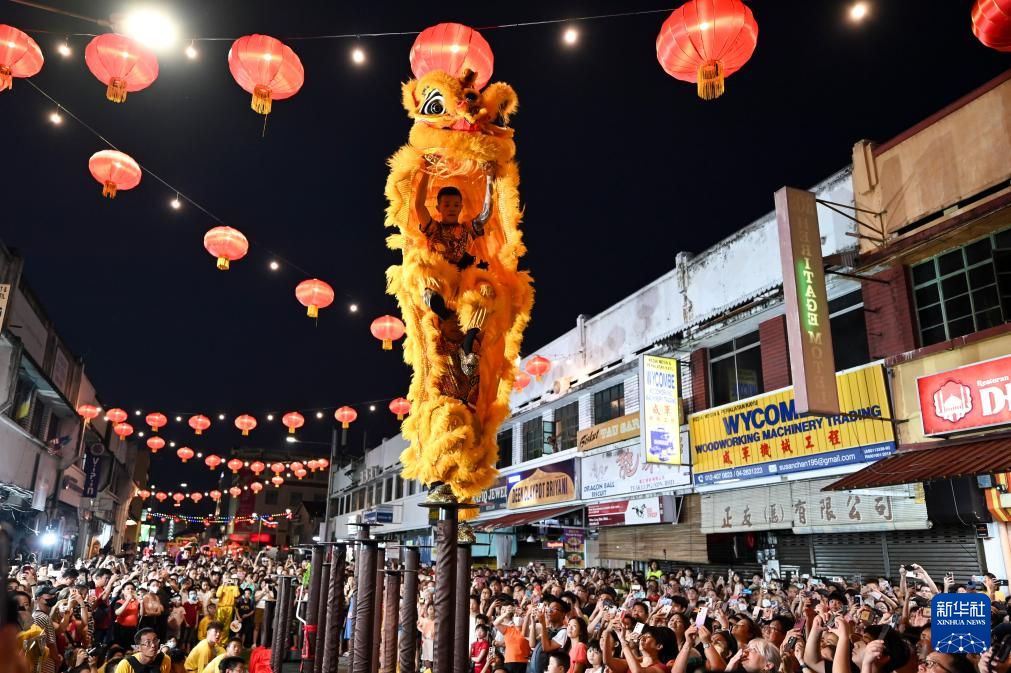 2月18日,槟城庙会舞狮表演吸引众多观众。新华社