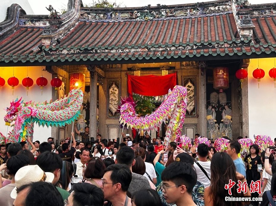槟城庙会的舞龙表演吸引游客观看。中新网