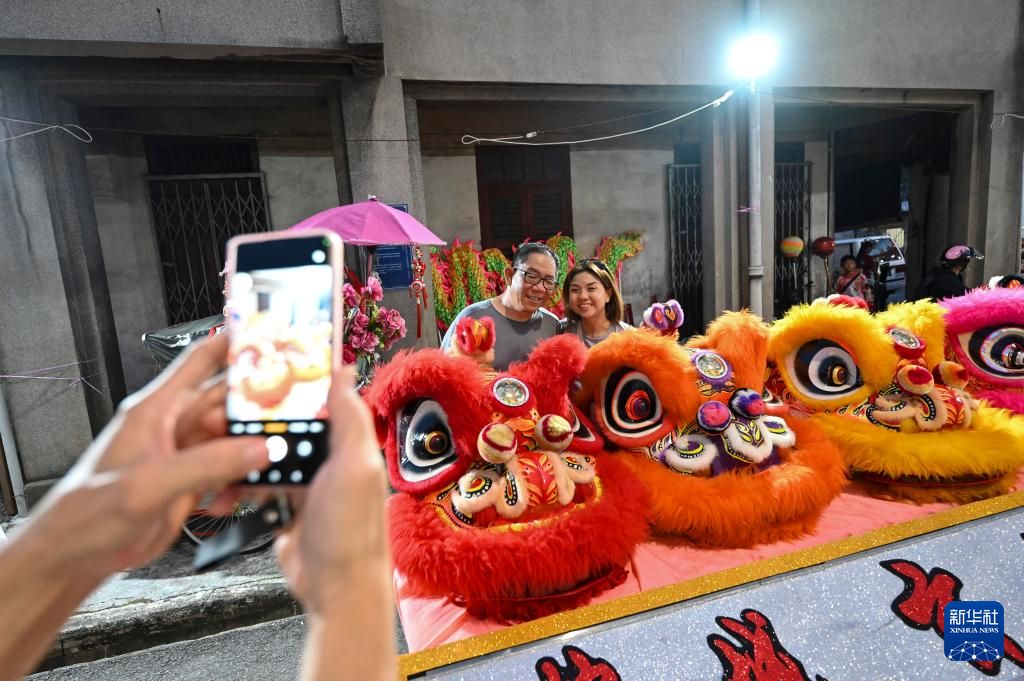 2月18日,在槟城庙会,人们在舞狮活动前与狮头合影。新华社