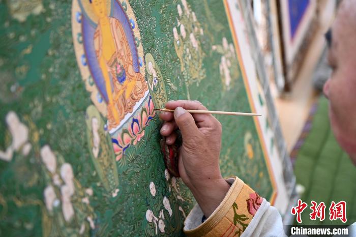交巴加布在个人工作室内给唐卡上色。一幅精美的唐卡作品,需要耗费画师几个月甚至几年时间。从勾线到着色,每一步、每一笔都要屏息凝神。中新网