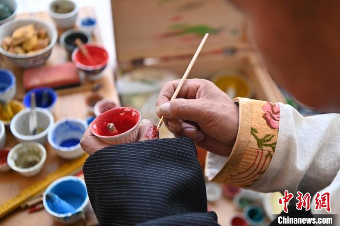 交巴加布的唐卡艺术之路始于童年。在父亲的熏陶下,他从小就对唐卡艺术产生了浓厚的兴趣。他不仅继承其父亲九麦的画风特点,还不断向其他画师求教学习,揣摩画技,使自己的技艺更上一层楼。图为交巴加布在个人工作室内调绘制唐卡所需的颜料。中新网
