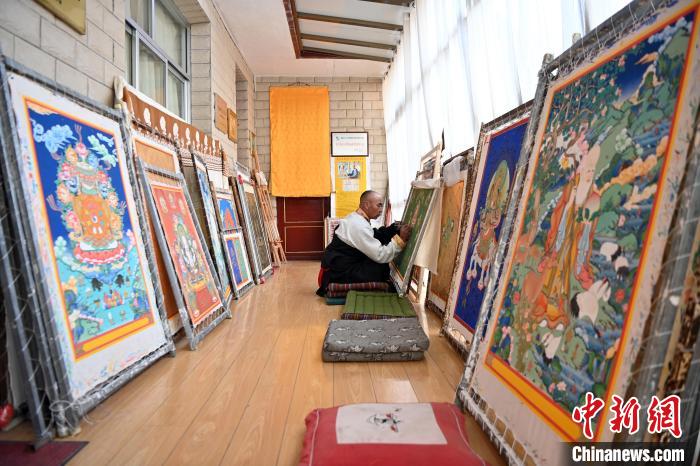 交巴加布的唐卡作品涵盖了布面彩绘唐卡、珍珠唐卡、刺绘唐卡、织锦唐卡等10余种类型。他在唐卡着色、晕染、勾线、上色等方面都有很深的造诣,使得他的作品色彩鲜艳、线条流畅、构图巧妙,充满了艺术魅力。图为交巴加布在其工作室内给唐卡上色。中新网
