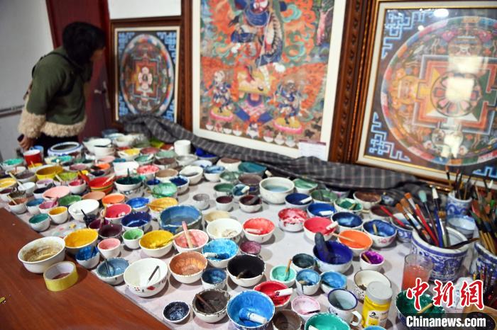 唐卡小镇位于甘肃甘南藏族自治州夏河县,集聚以拉卜楞唐卡为代表的甘南藏族唐卡,入驻数十家企业及画室。“世界藏学府”拉卜楞寺比邻的唐卡小镇,甘南藏族唐卡代表性传承人交巴加布的画室就位于这里。图为唐卡小镇一画室内摆出大大小小已完成的唐卡和各色颜料。中新网