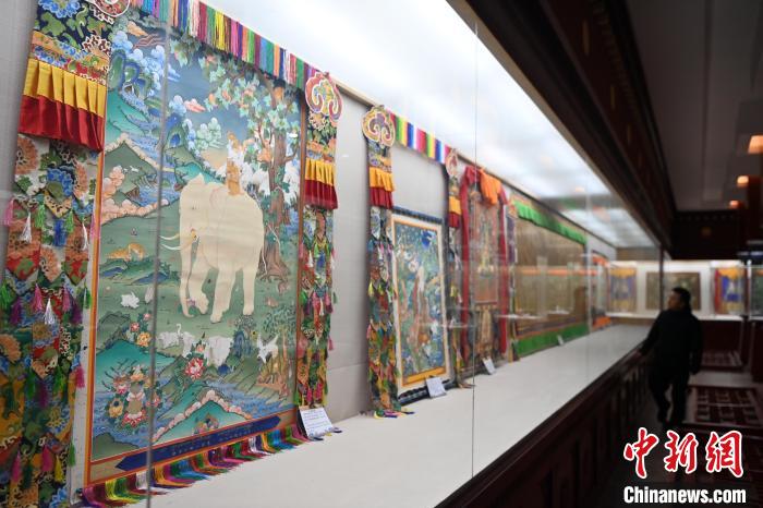 游客在唐卡小镇一展厅内参观展出的唐卡作品。中新网
