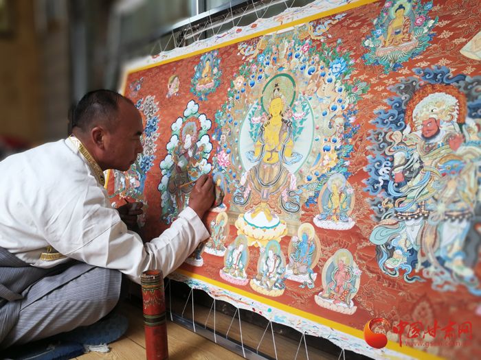 交巴加布用40多年,绘制了大大小小500多幅唐卡作品,以深厚的唐卡绘画功力得到了藏文化界的赞扬和肯定。图为交巴加布绘制唐卡。中国甘肃网