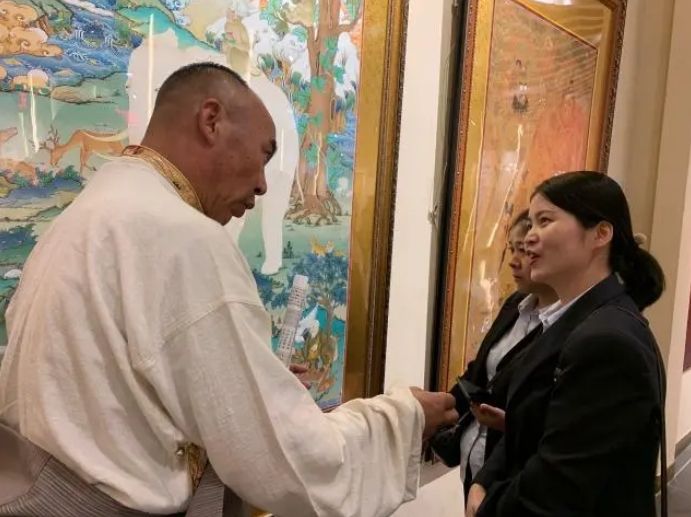 距离唐卡小镇数十米远的精品唐卡展厅,摆满了中国甘南藏族唐卡国家级代表性传承人交巴加布与父亲二人的作品。图为交巴加布与父亲的唐卡作品吸引游人“打卡”。中新网