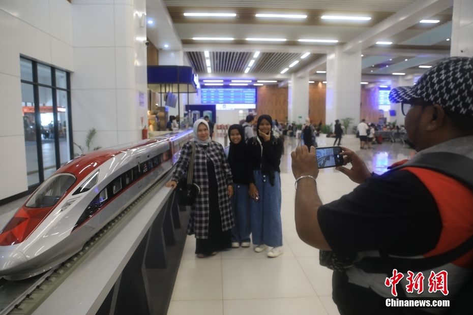 截至当地时间3月3日,印尼雅万高铁累计发送旅客突破200万人次,单日旅客上座率最高达99.6%,客流持续保持高位态势。据悉,雅万高铁自2023年10月17日正式开通运营以来已安全运营139天。图为3月3日,在印度尼西亚雅加达哈利姆高铁站,民众与高铁模型合影。