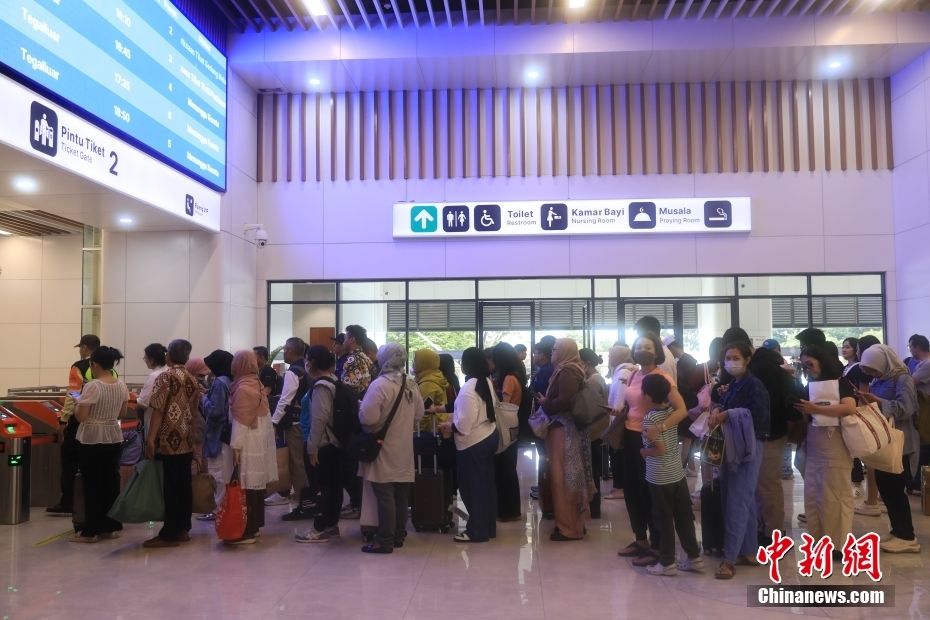 3月3日,民众在雅加达哈利姆高铁站排队等候检票。