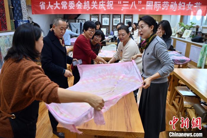 第114个“三八”国际妇女节来临之际,中国甘肃省妇联策划推出民俗体验、专场招聘、维权开放日等系列活动,为女性送上关爱和温暖。3月1日至8日,“回娘家、体民俗、绽芳华”活动在甘肃省妇女儿童服务中心开展,为妇女们提供更多提升自我的平台。图为妇女展示扎染的丝巾。中新网