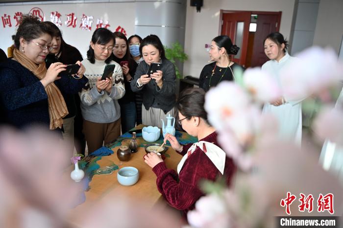 “回娘家、体民俗、绽芳华”系列庆祝活动吸引科技、教育、医疗、税务等各行各业的近千名妇女,通过体验丝巾扎染、茶文化体验、手绘团扇、传拓技艺以及养生锤制作等丰富多彩的民俗项目,感受传统文化魅力。图为妇女们参与茶艺文化体验项目。中新网