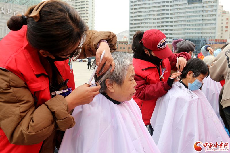 3月5日,甘肃省妇联“丝路花开”巾帼志愿服务队在兰州东方红广场开展“学雷锋”主题巾帼志愿服务活动。图为志愿者为老人理发。中国甘肃网