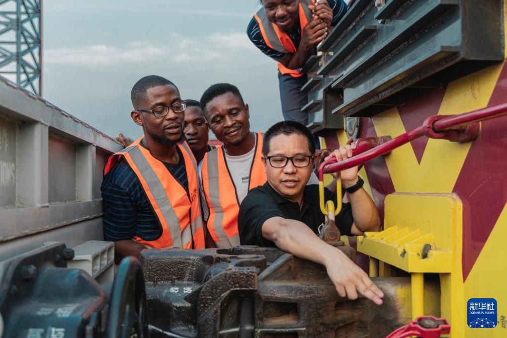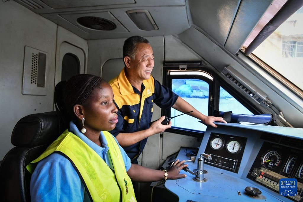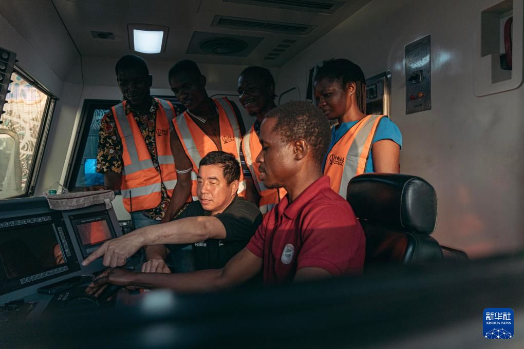 3月2日,在尼日利亚拉各斯的拉伊铁路莫博拉吉·约翰逊火车站,中方指导司机魏汝军与当地司机塞拉·阿比亚拉在驾驶室调整车辆,准备发车前往伊巴丹。新华社
