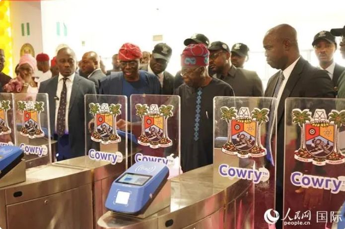 尼日利亚总统提努布、拉各斯州州长桑沃-奥卢出席拉各斯轻轨红线项目一期通车仪式。图为尼日利亚总统提努布(前排右二)、拉各斯州州长桑沃-奥卢(前排右三)在刷卡进站。人民网