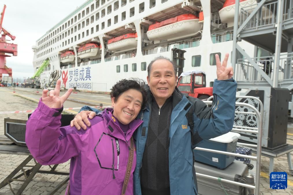 3月6日,搭乘“梦想”号国际邮轮的旅客登船前在码头拍照留念。新华社