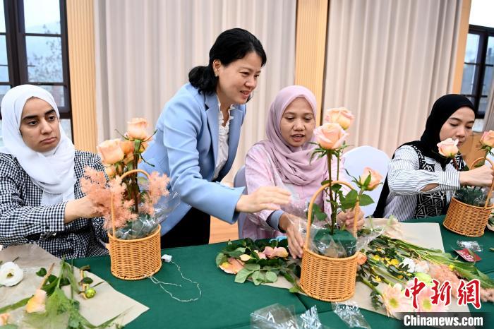 3月5日,在福建省漳州市,中外妇女参加庆“三八”艺术插花活动,花艺老师现场教学。中新网