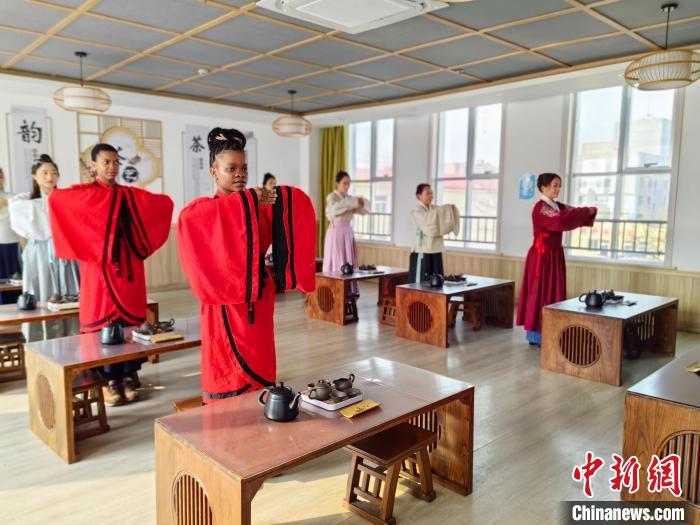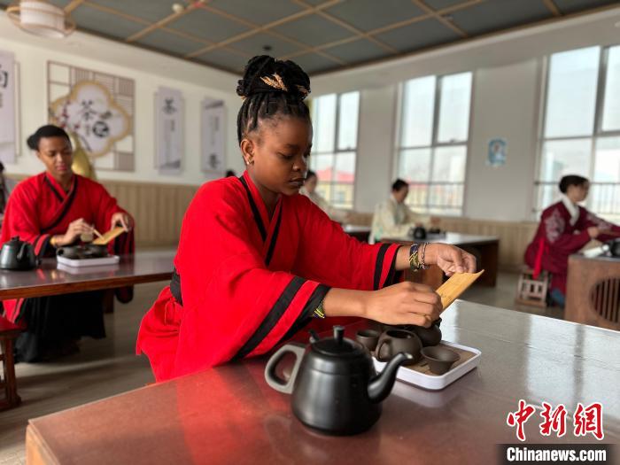 3月6日,来自坦桑尼亚的翟阿达在学习中国茶道文化。中新网