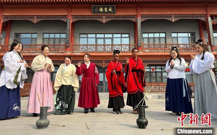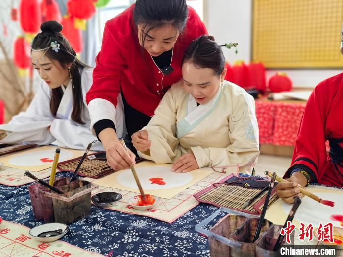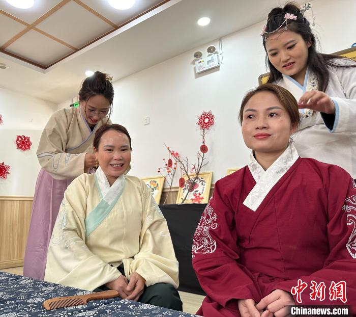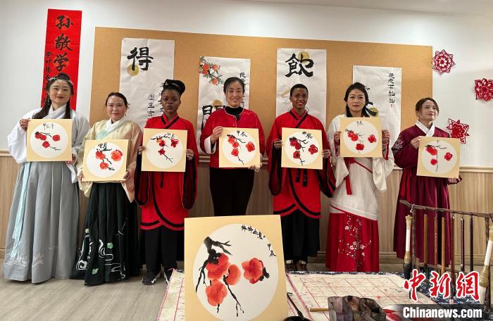 3月6日,外籍友人在联谊活动中体验穿汉服。中新网