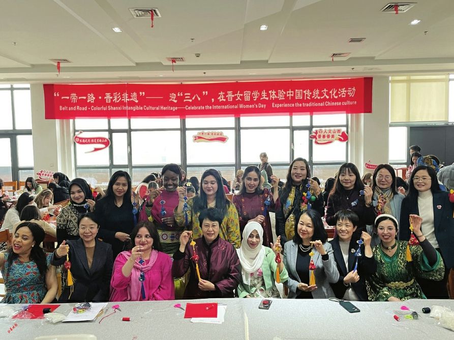 3月5日,在山西医科大学中都校区,“一带一路·晋彩非遗”迎“三八”在晋女留学生体验中国传统文化活动拉开帷幕。图为留学生们展示亲手制作的香囊。山西新闻网