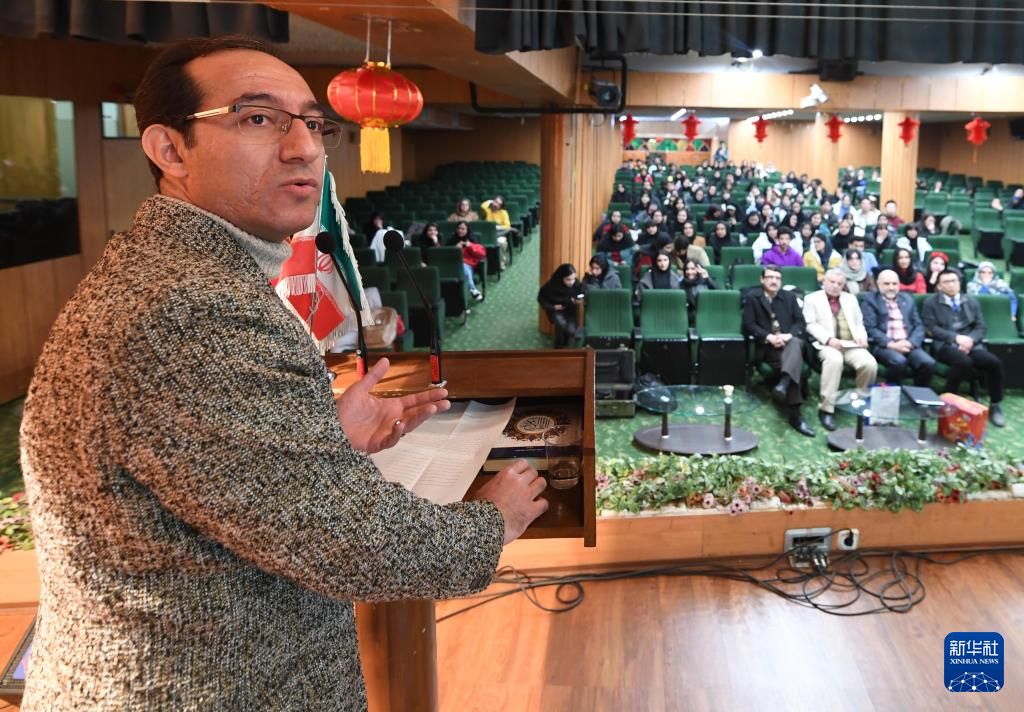 在伊朗首都德黑兰阿拉梅塔巴塔巴依大学举行的中国文化体验活动上,阿拉梅塔巴塔巴依大学中国研究中心主任穆罕默德·阿米尔·贾拉利做中伊文化交流情况的演讲。