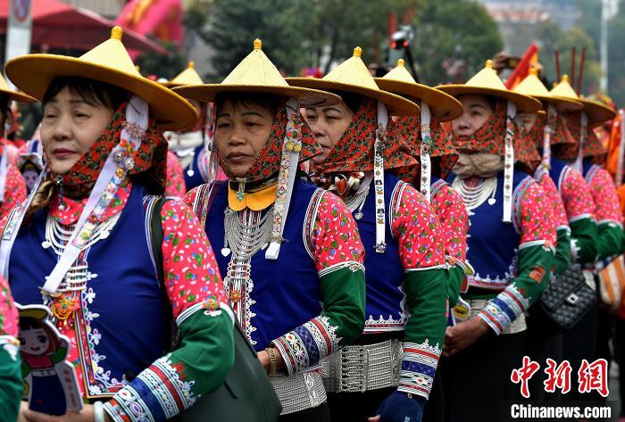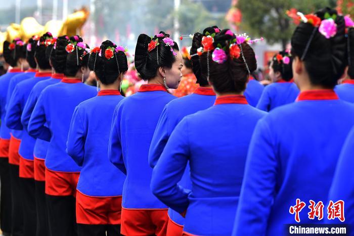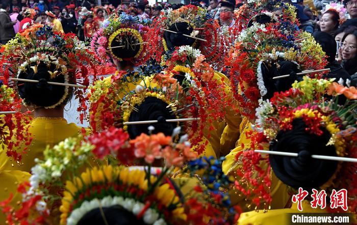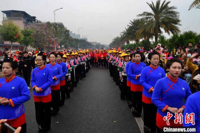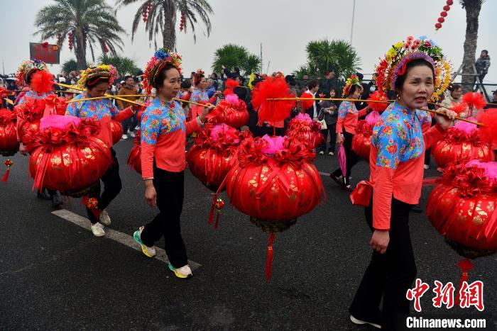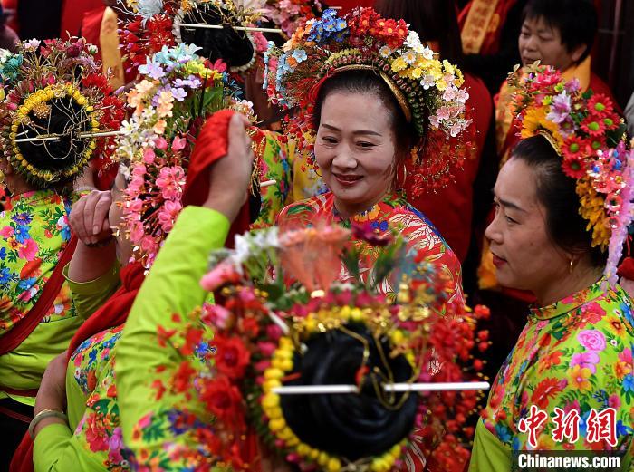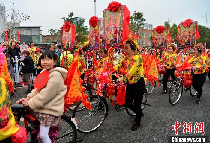 3月9日,蟳埔女们身着大裾衫,头戴“簪花围”在巡境队列中。中新网