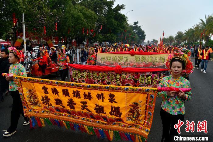 3月9日,福建省妈祖“天香巡境”民俗活动在泉州市丰泽区蟳埔民俗文化村举行。妈祖“天香巡境”由当地民众自发组织,历史悠久,是蟳埔影响最大、全体民众参与且传承了数百年的民俗文化活动,展现着蟳埔人原汁原味的民俗文化。当日,并称为福建三大渔女的“惠安女”“湄洲女”“蟳埔女”同场亮相,成为一道靓丽的风景线。图为妈祖“天香巡境”民俗活动,“惠安女”“湄洲女”(蓝色上衣)前来助阵。中新网
