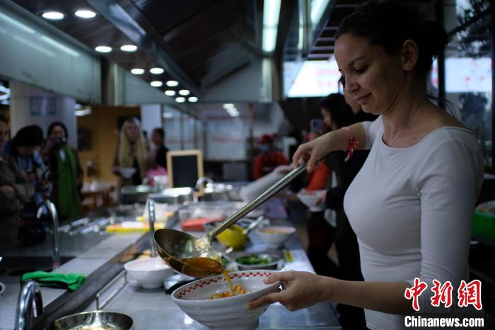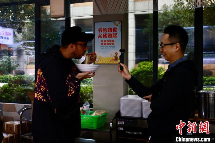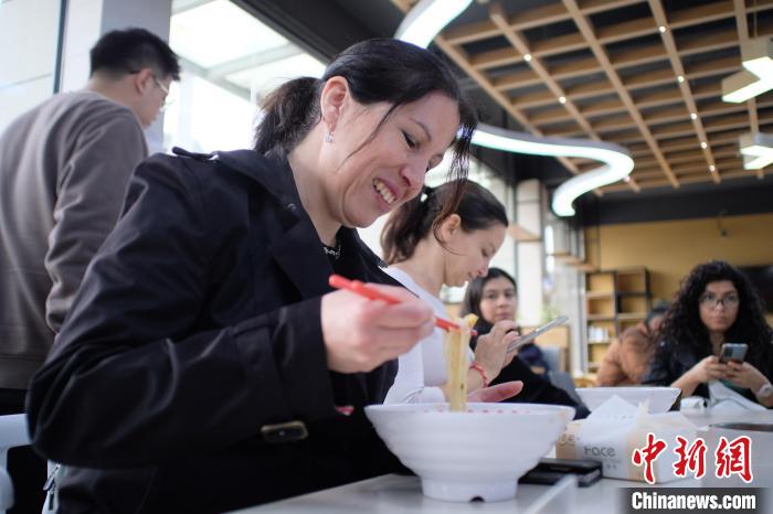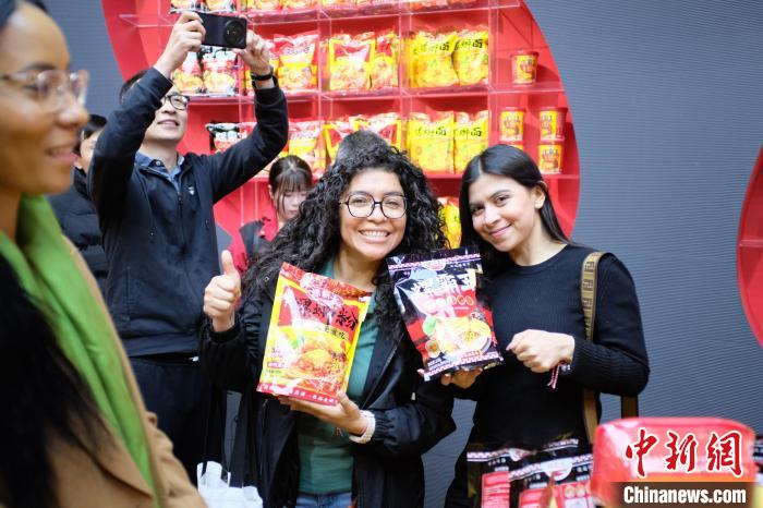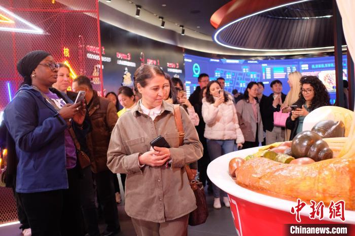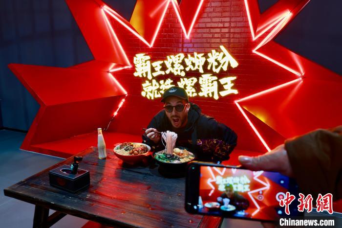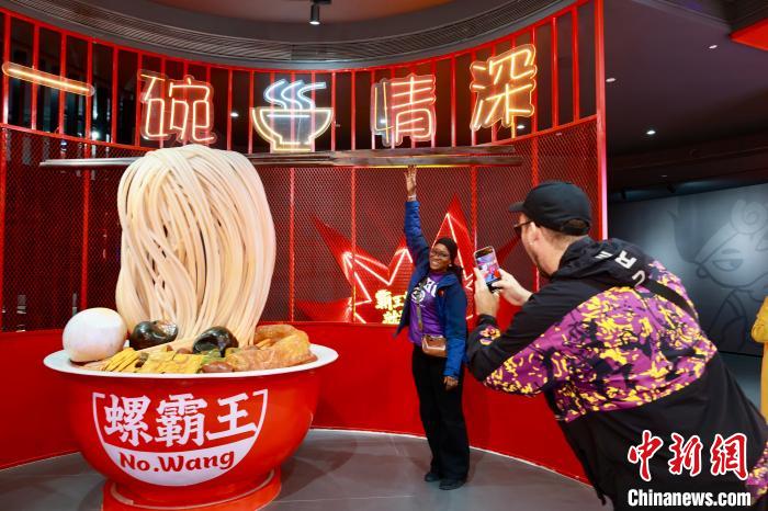 外媒记者在巨大的螺蛳粉模型前拍照“打卡”。