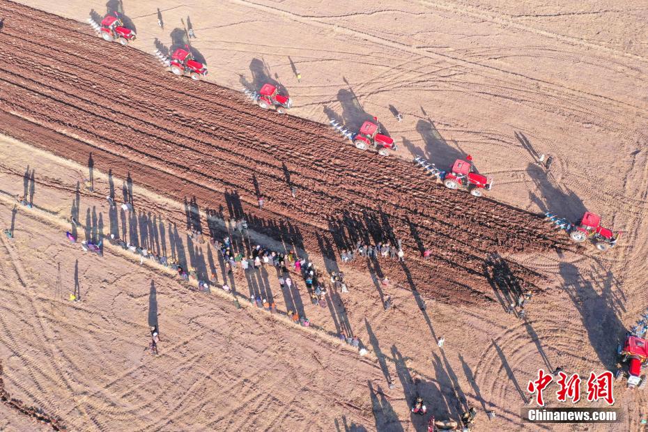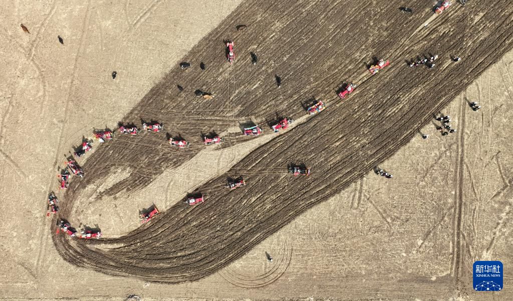 拉萨市林周县春堆乡春耕仪式现场,农民沿袭传统,使用二牛抬杠翻土犁地。新华社