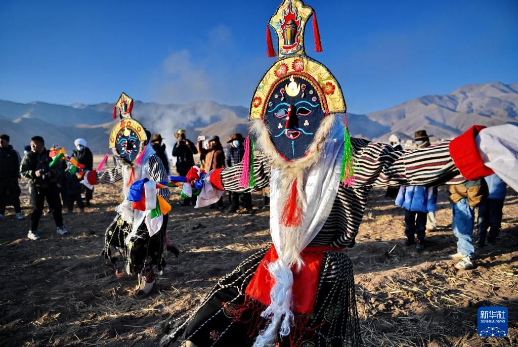 在拉萨市林周县春堆乡的春耕仪式现场,当地民众表演藏戏。新华社
