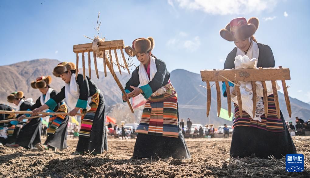 在拉萨市堆龙德庆区马镇马村的春耕仪式现场,农民平整田地。新华社
