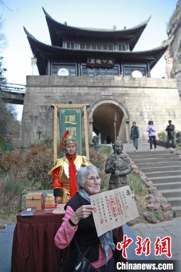 2016年,贾和普被授予“首批剑门蜀道三国文化旅游推介大使”称号,她早已成为了一名“蜀道通”,并推出了一本图文并茂的书《中国古蜀道徒步指南》和开设了剑门蜀道网站,向全世界推荐剑门蜀道的山川美景、民风民俗等。图为3月18日,贾和普在剑门关体验办理《通关文牒》。中新网