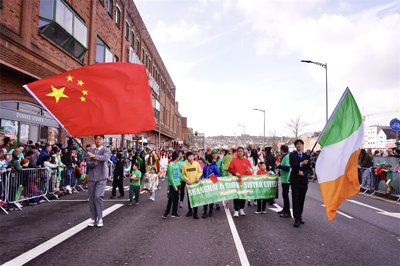 科克大学孔子学院组织的队伍手持中爱两国国旗,手拉科克与上海友好城市的横幅。人民网/科克大学孔子学院供图